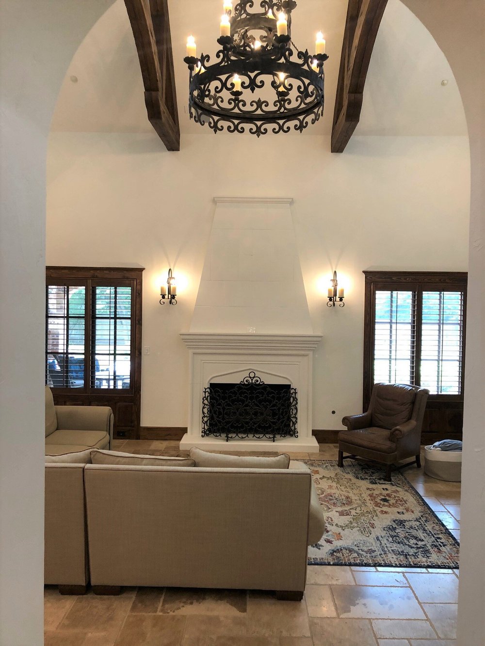 These sculptural bronze sconces and chandelier sparkle with gilded accents that pick up on the colors of the tiled area rug, which introduces touches of mediterranean blue.